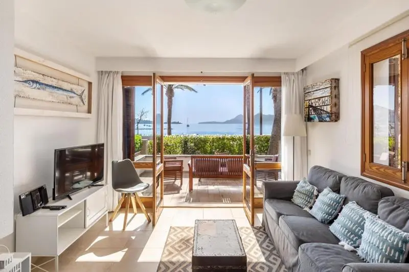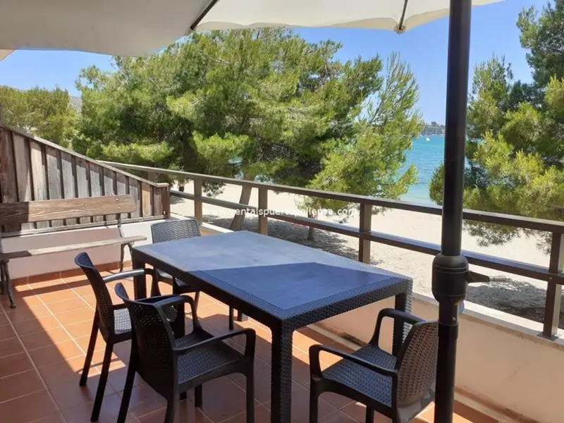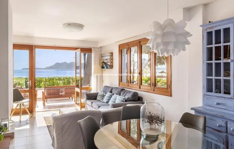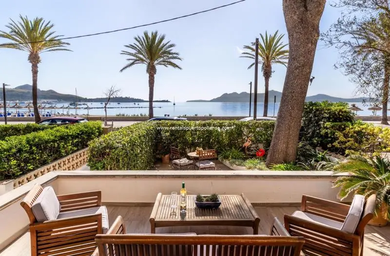 Beautiful beach front property situated opposite the wide sandy beach. This is an ideal ground floor apartment with beautiful sea views and lovely large wrap around terrace. The terrace is furnished and has ample shade, perfect for dining al fresco. This property is a ground floor apartment, just steps from the beach and a five minute walk to the centre of Puerto Pollensa.