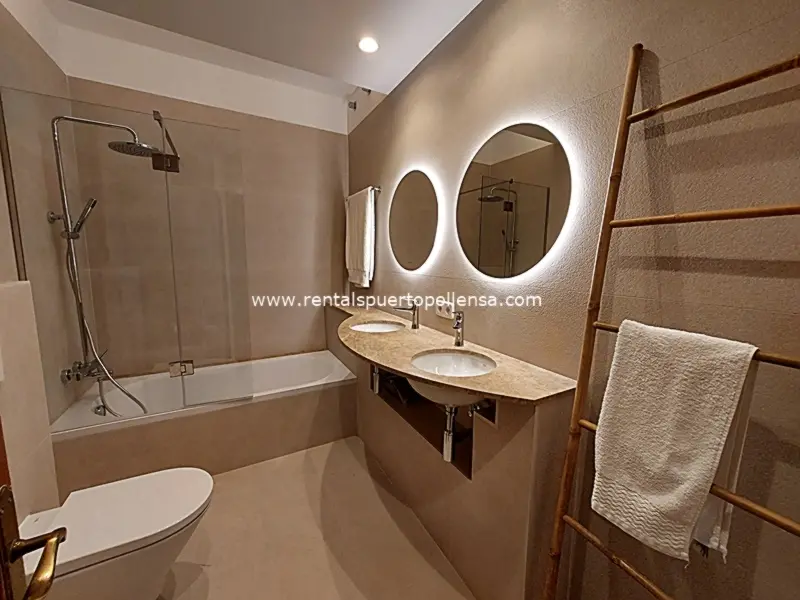 Inside the property there are four bedrooms; two air-conditioned twin bedrooms, an air-conditioned single room and an air-conditioned master double bedroom at the front of the property which has picture windows out to the Pine Walk. Each of the bedrooms have en-suite bathrooms; three shower rooms and a complete bathroom from the master bedroom.