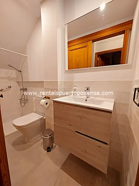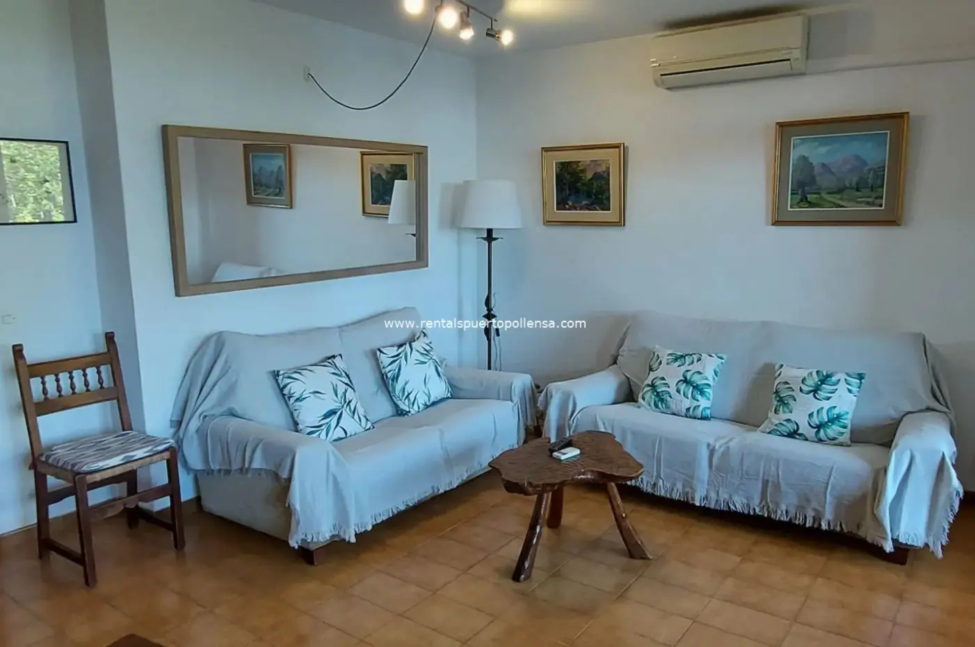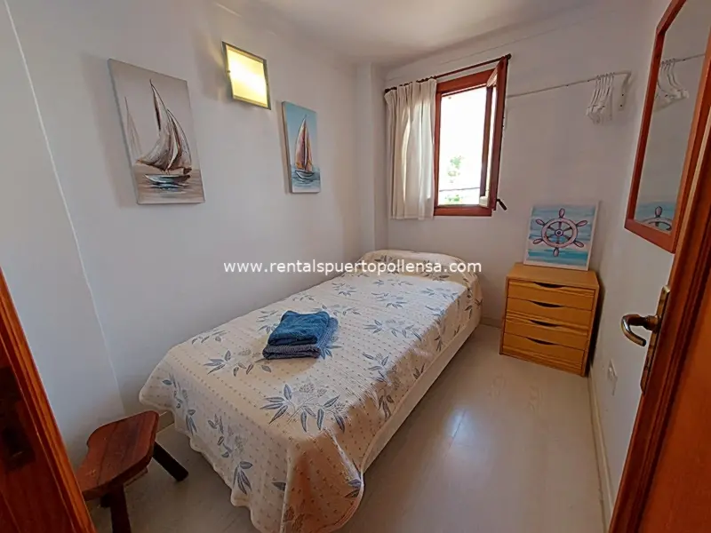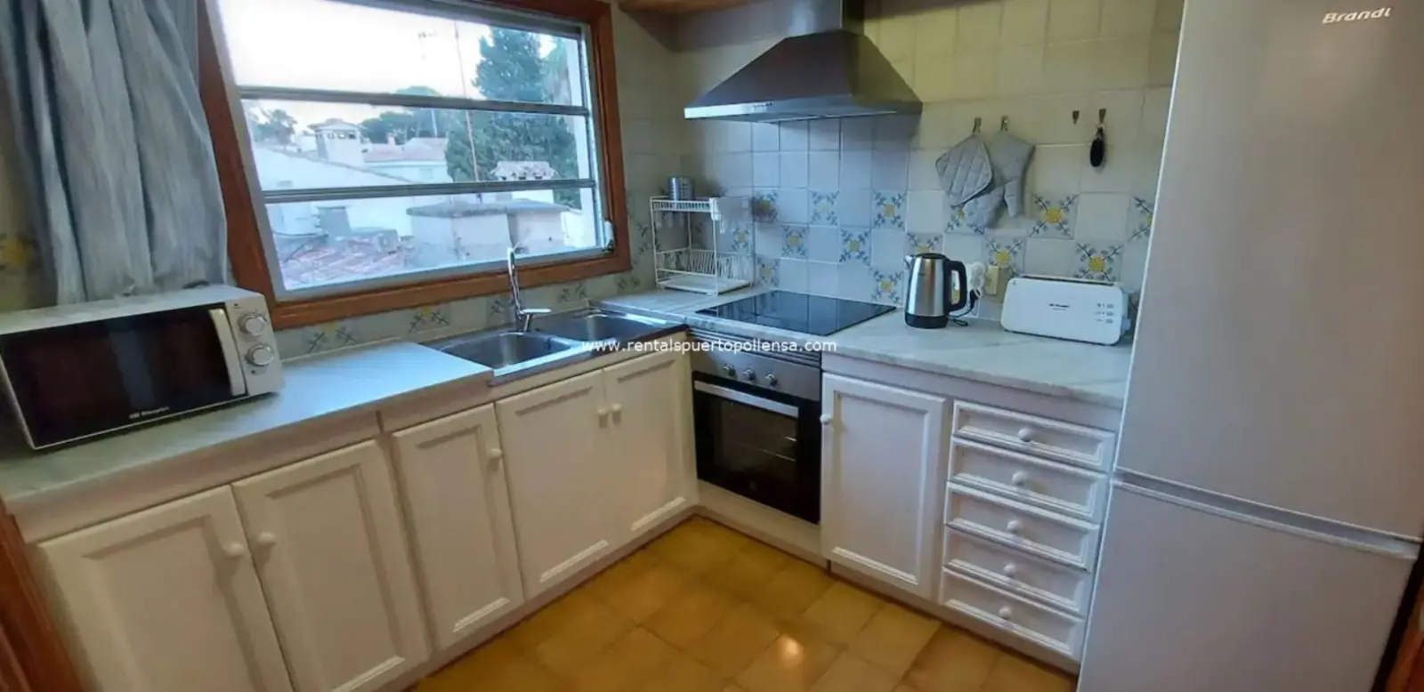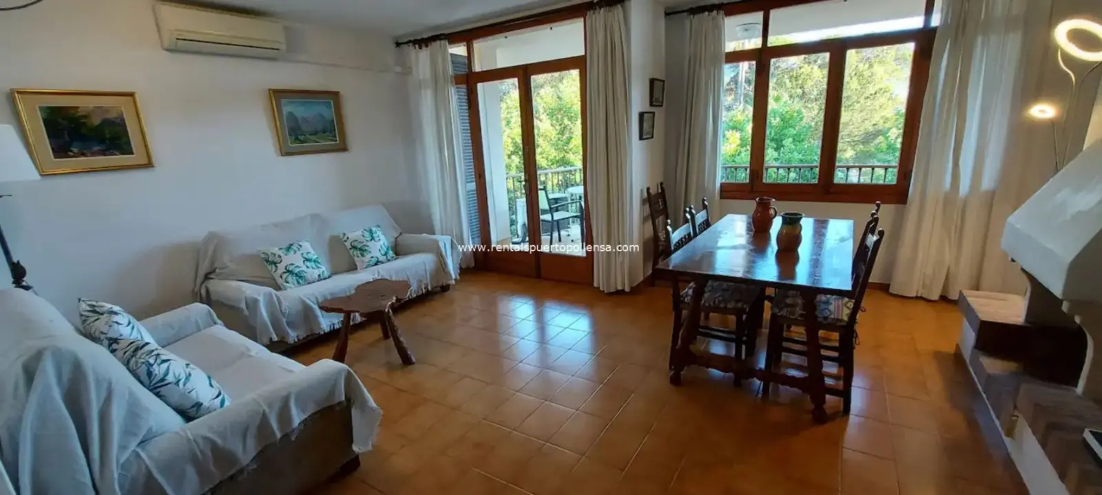 The Pine Walk beach is just 20 metres from the front of the building and the local supermarket 20 metres behind. A fifteen minute flat stroll takes you into the centre of the Puerto Pollensa. Inside the entrance hall leads to the lounge/diner (with air conditioning, television) and a seperate well equipped kitchen.